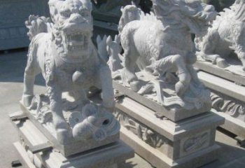 放在門口左側的雄獅一般都雕成麒麟雕塑玩弄繡球或者兩前爪之間方一個繡球張嘴型。門口右側雌獅則雕成左前爪撫摸幼獅或者兩前爪之間臥一幼獅。